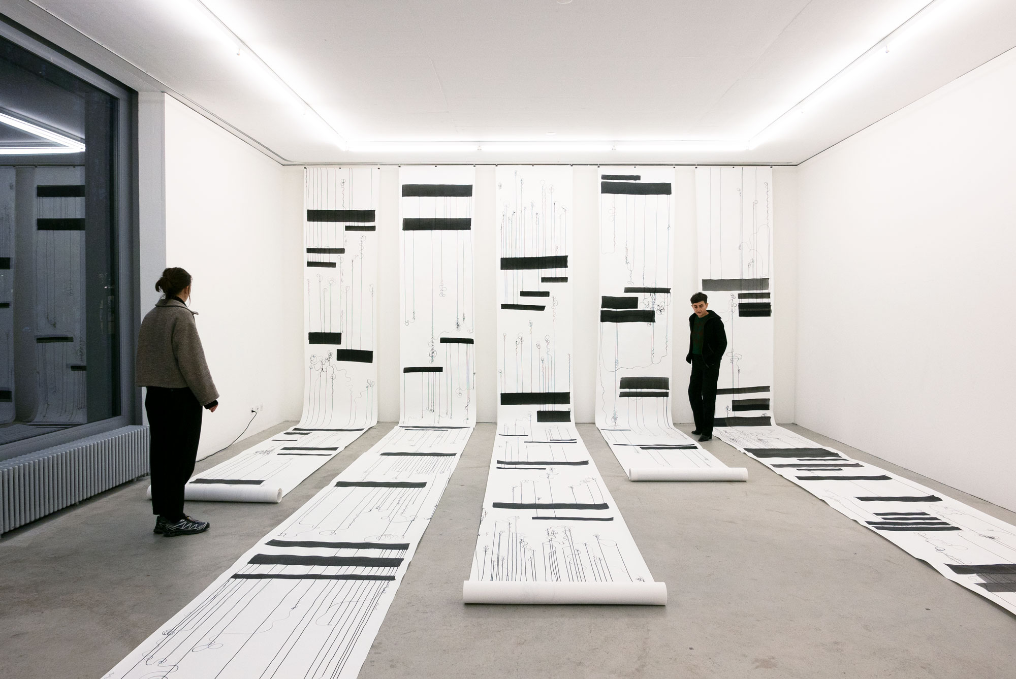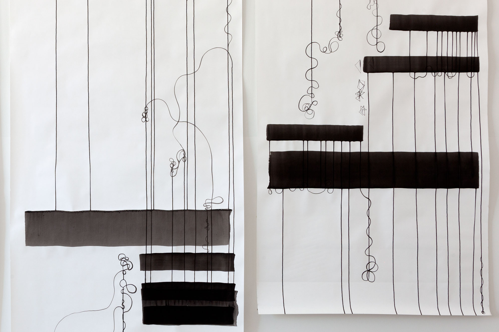 Strong brushstrokes structure the strip, while the flow of ink creates fine lines that are deflected into loops and flourishes. Monotony versus playfulness, chance and control determine the essence of these drawings. They can be installed in different rooms, varying in size and width, in an installation-like and expansive manner.
